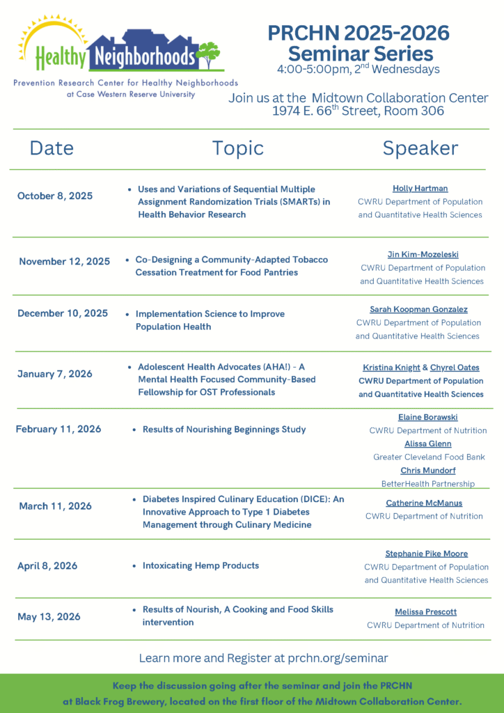 We are so excited to be hosting our Seminar Series in our new home at the MidTown Collaboration Center! This year, we will be featuring the work of our PRCHN Faculty Associates who are doing some pretty fantastic work!